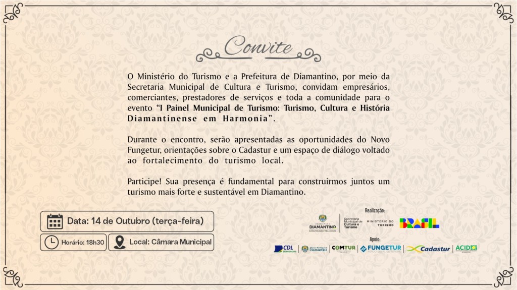 Diamantino Prefeitura de Diamantino e Ministério do Turismo convidam a comunidade para o I Painel Municipal de Turismo